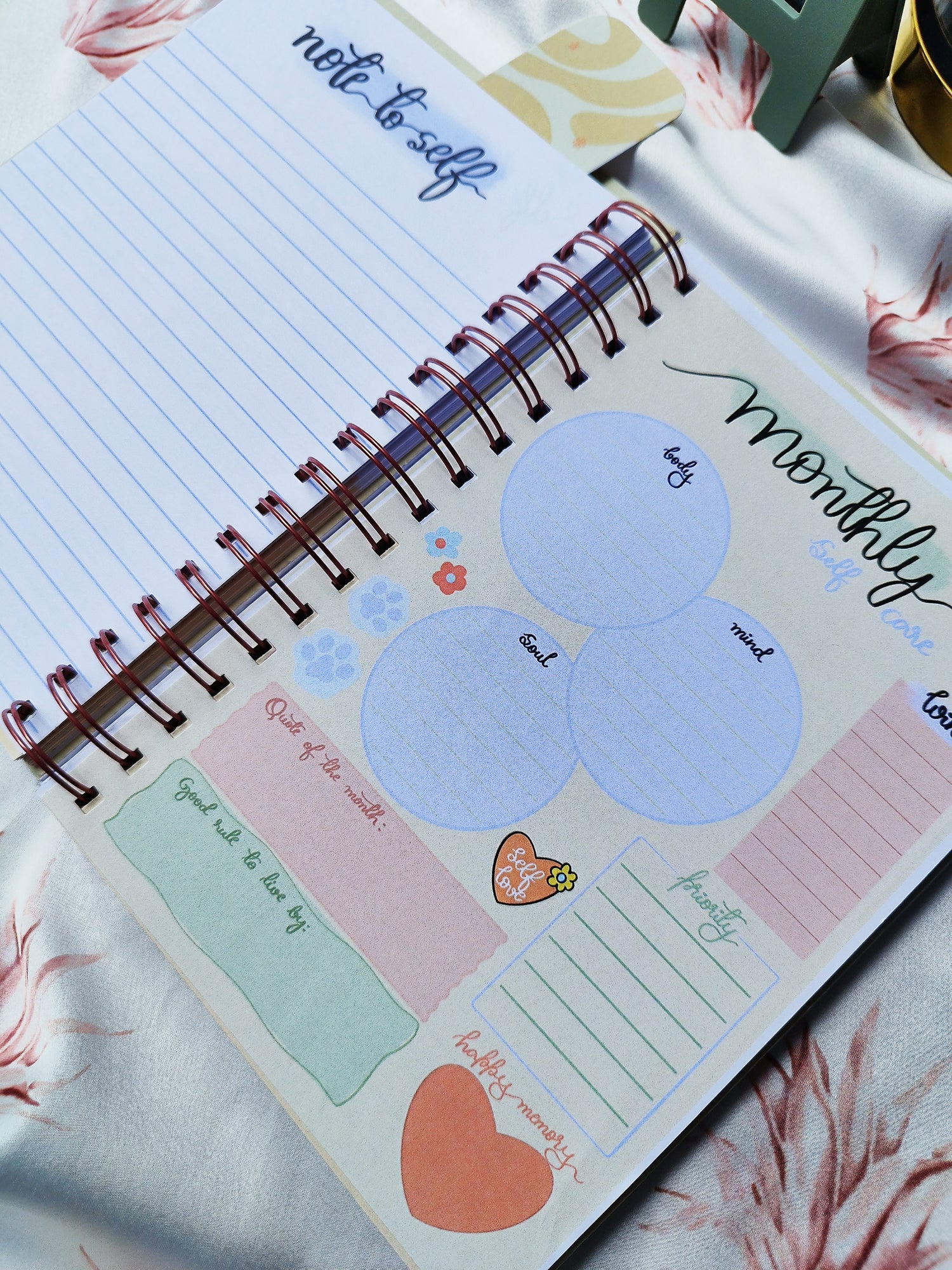 The Journal consists of 208 pages, designed for 6 months of daily self-care and mindfulness, empowering you to track your progress and set meaningful goals!